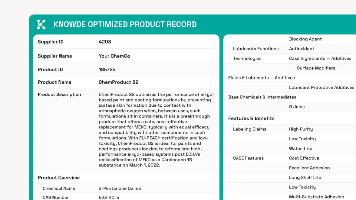 Enrichment of Vendor and Raw Material Records: We enrich vendor records with size, locations, other products available in their portfolio and more. Knowde AI enriches raw material records to include distribution channels and potential equivalent materials purchased across locations globally. This allows for identification of consolidation opportunities and avoids raw material proliferation as new materials are considered for product development.
