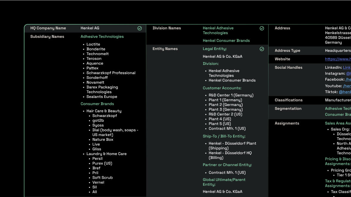 Unify Customer Data: Merge and deduplicate accounts, creating golden records with parent-subsidiary-site hierarchies.